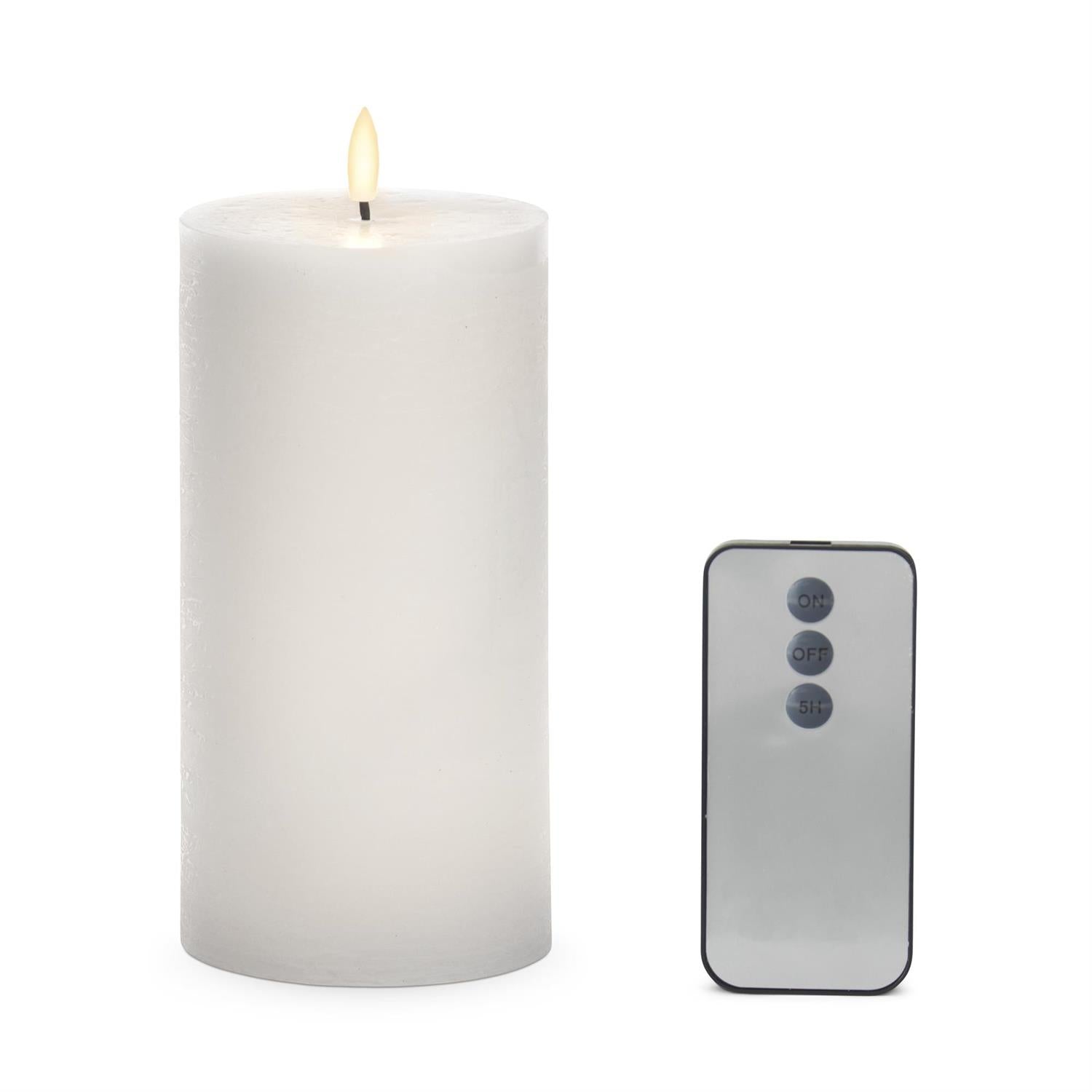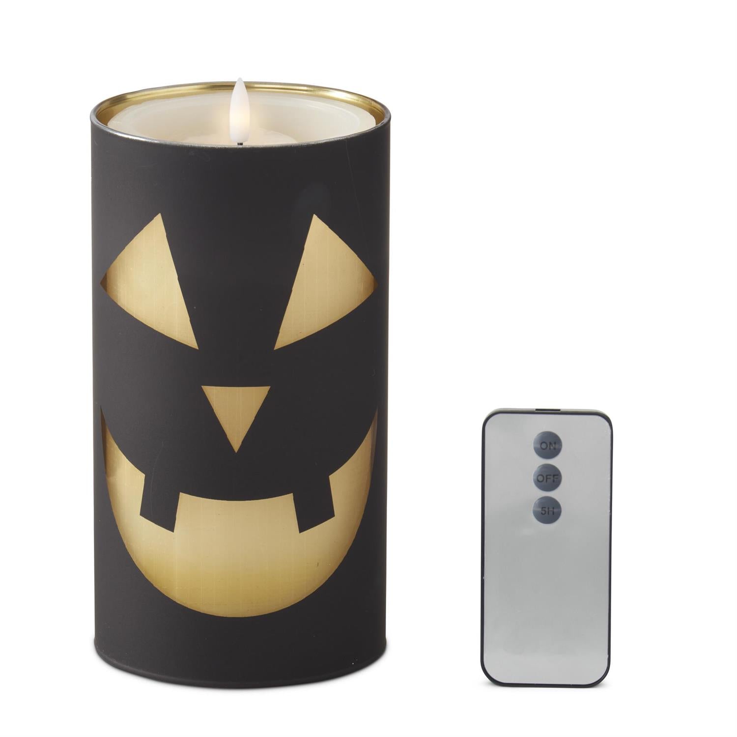 Get ready for spooky season with this LED candle that has a metal slip cover black jack o lantern. The quaint flicker of the LED light will be the perfect addition to your Halloween decor. The best part is the slipcover is removeable to reveal a solid white LED candle that can be used year-round! The candle has on/off and timer settings. Remote is included. Item Dims: 7.75H x 4W x 4D; requires 2 AA batteries.