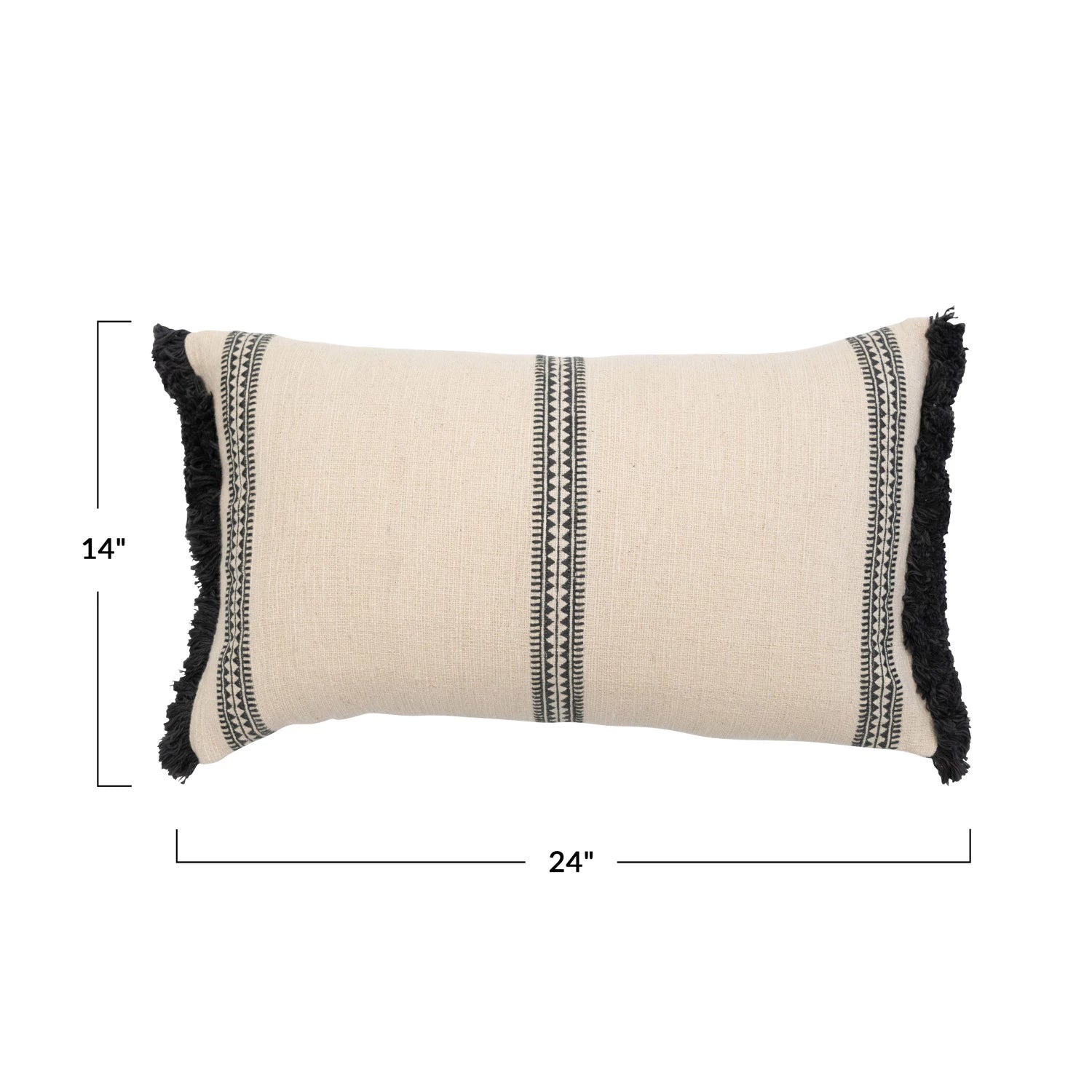 Black and natural cotton slub lumbar pillow with embroidered stripes and fringe. This cozy pillow looks great on the living room couch or on a bed!