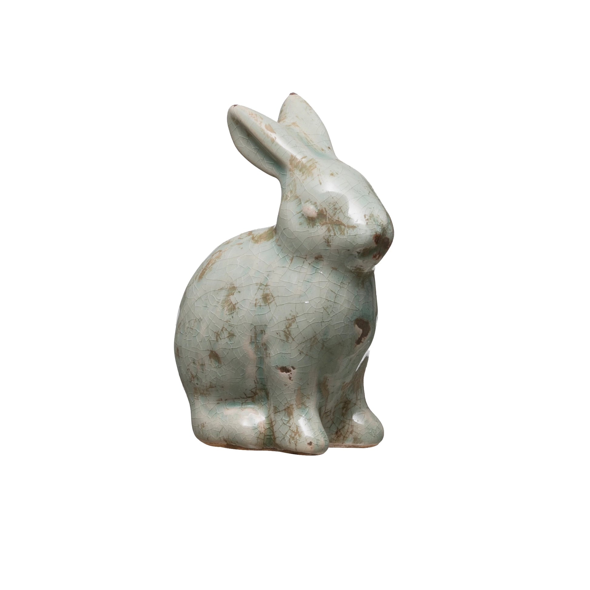 Hop into whimsy with this charming, distressed terracotta rabbit, where reactive crackle glaze creates a one-of-a-kind aqua finish. Each piece is beautifully unique—no two are exactly alike, making yours truly special. The weathered texture and artistic glaze variations give it rustic character perfect for garden displays, shelves, or as a delightful gift for rabbit lovers. A playful accent that celebrates imperfection and handcrafted charm. Each one will vary.