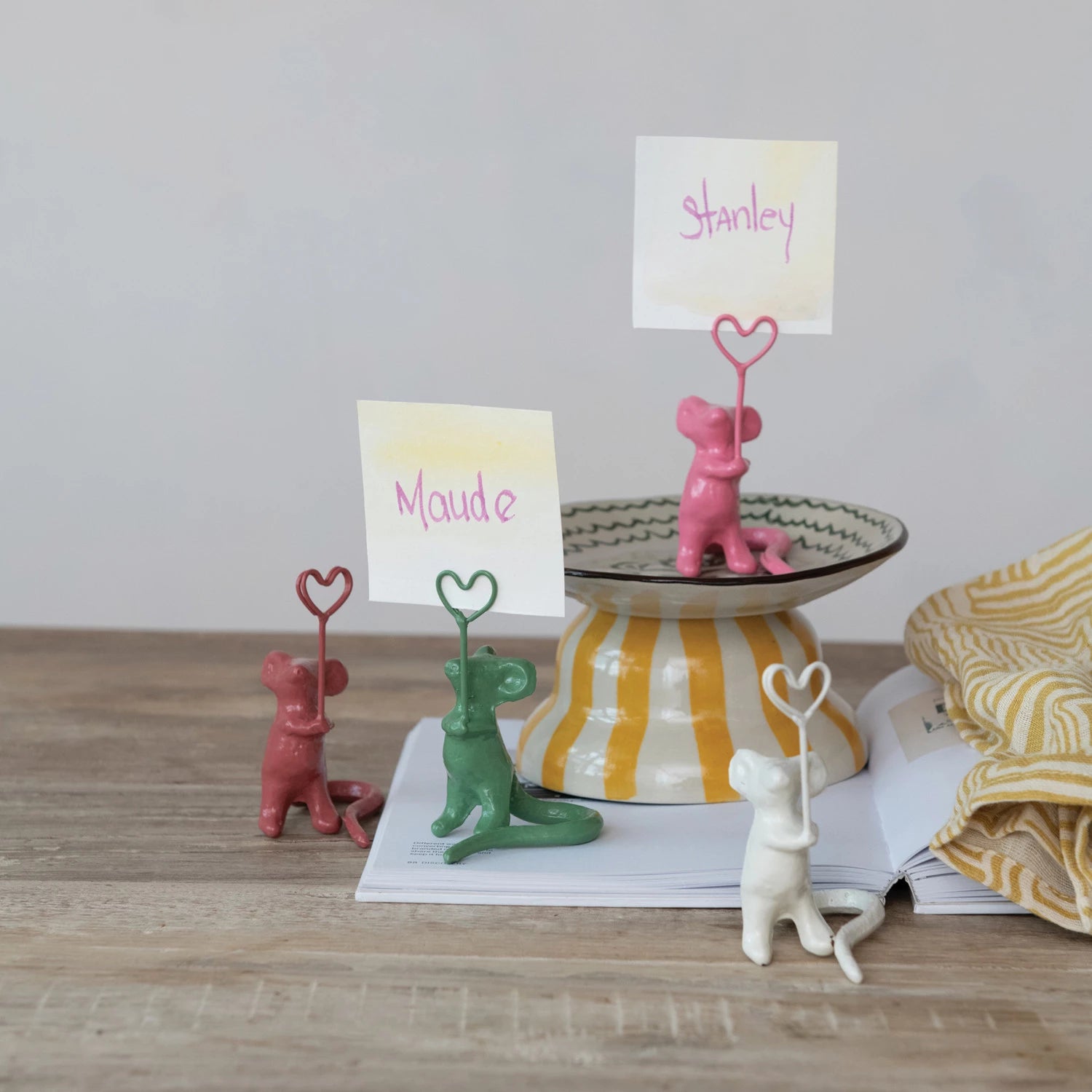 Enameled Cast Iron Mouse Holding Heart Shaped Place Card/Photo Holder, 4 Colors