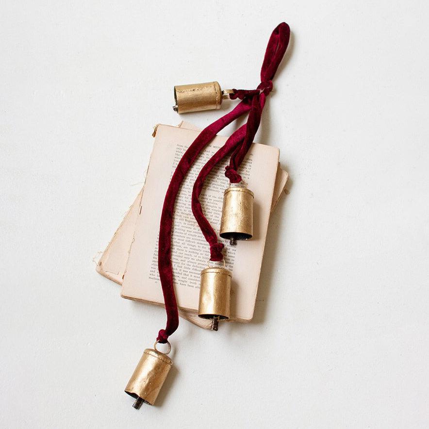 Ring in the holiday season or announce Santa's arrival with this strand of four bells. These metal bells have an antique gold finish and are tied on a burgundy velvet rope. Excellent for use with garland, wreaths or on a Christmas tree. Add a set to your holiday collection for door decor.