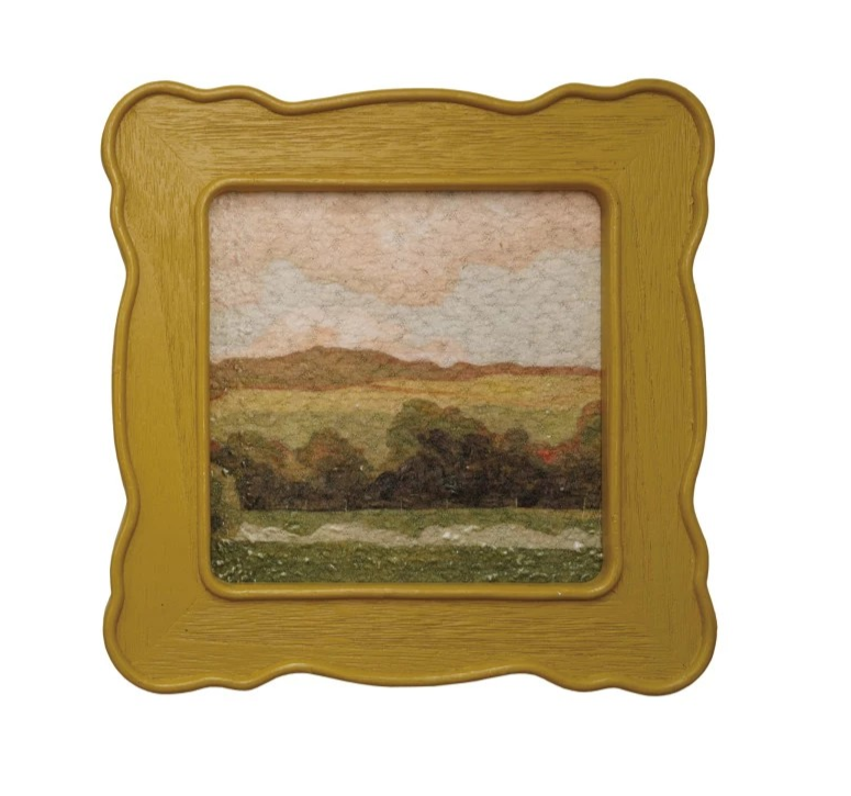 These fabric landscape prints are a little retro and a little Bo-ho. Whatever your style, you will love the neutral tones and open-air feel of these unique prints. Both styles are finished in a unique scalloped subtle yellow hue, wood frame. Perfect for creating a cozy, inviting atmosphere while making a stylish statement on your walls. Each style sold separately.