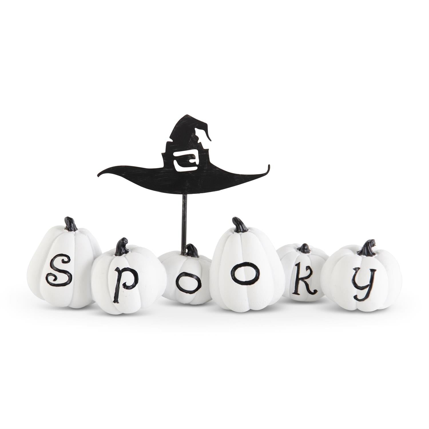 How s p o o k y is this Halloween piece!? 6 attached resin pumpkins spell out "spooky" and a witch hat stands up in the back to tie it all together. See our matching "boo" piece at "BOO" Pumpkins w/Metal Witch Hat