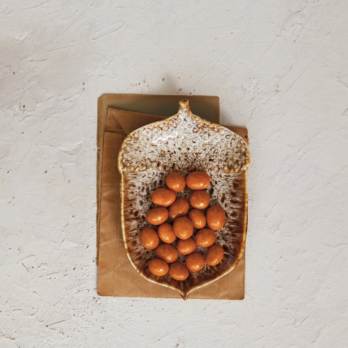This small acorn tray is coated with a reactive glaze, making each piece unique with different variations. Use this for treats at your next fall party, to hold your rings, or to display small trinkets! Two sizes to choose from!