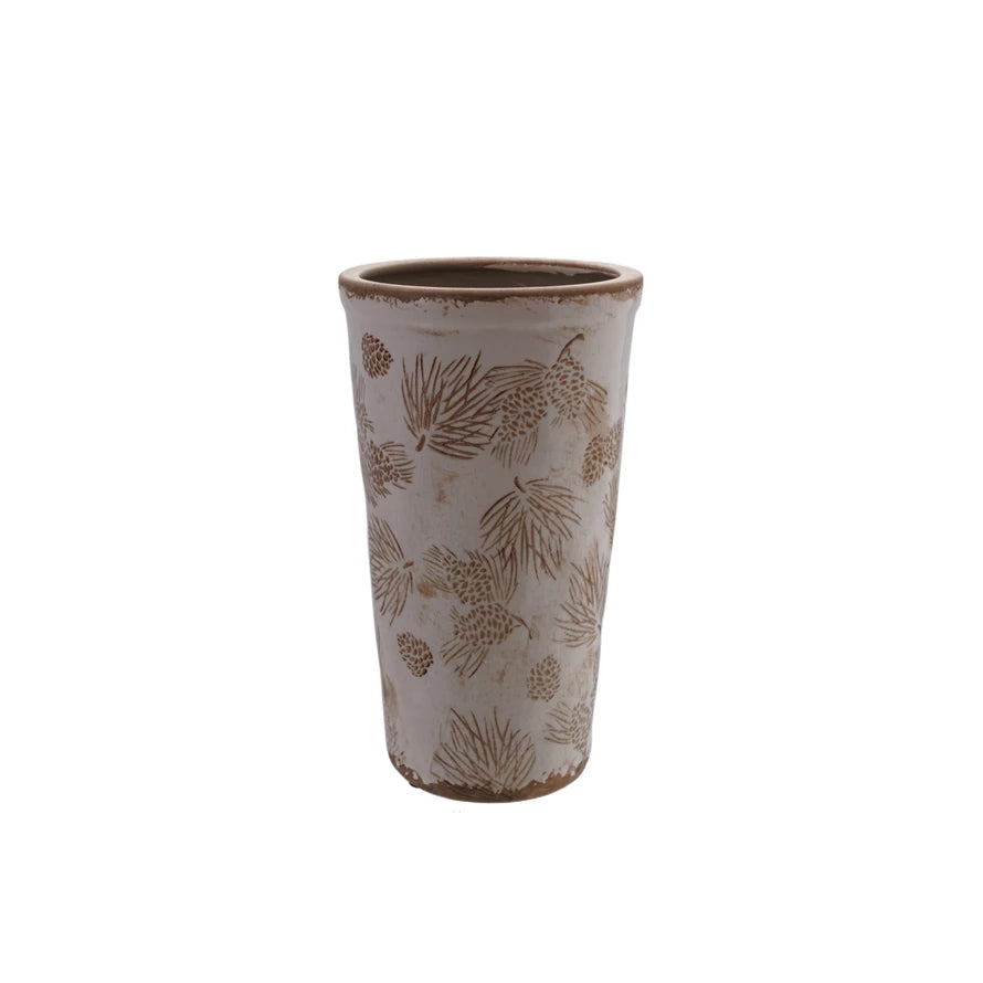 Stoneware Vase with Evergreen Boughs & Pinecones Pattern Brown & White
