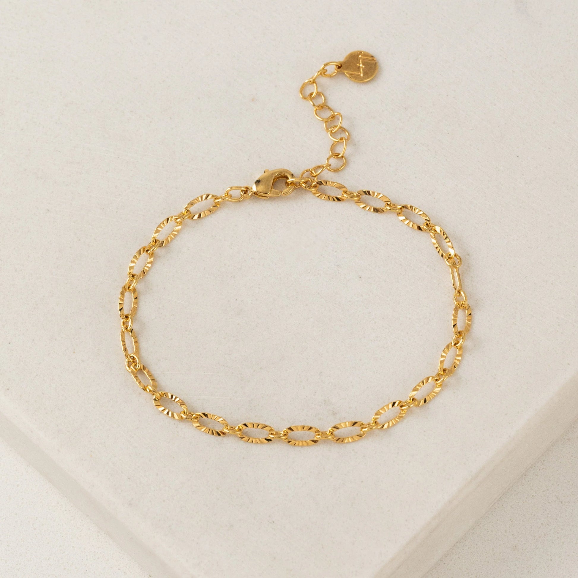Elevate your elegance with the Swift Chain Gold Bracelet, a refined accessory crafted to enhance any ensemble. Its sleek gold links offer a timeless shimmer, combining durability with delicate sophistication for everyday wear or special occasions. This bracelet complements your style with subtle luxury, making it an essential piece for the discerning wardrobe.